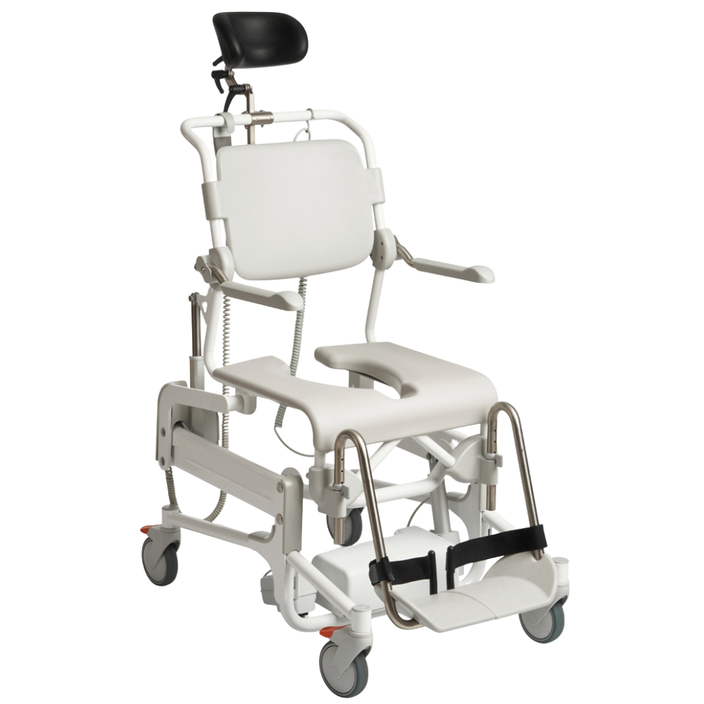A shower commode chair with a tilt-in-space function, featuring a tilt angle range of -5° to 30°, suitable for various care needs.