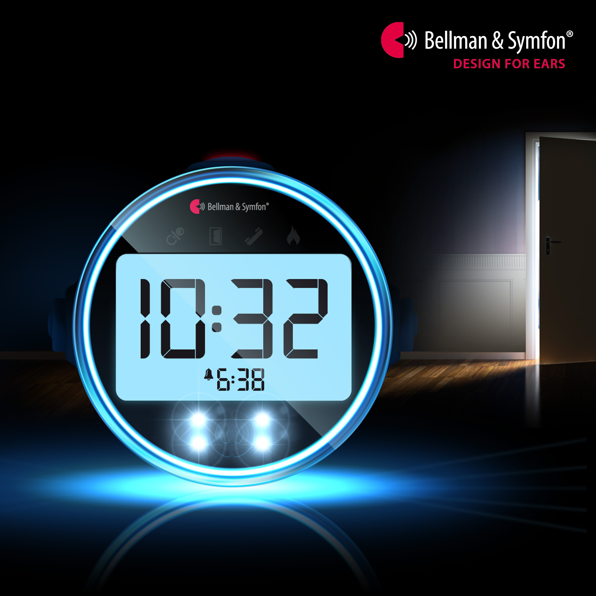 This alarm clock connects to the Visit™ Smart Home System. It awakens you with a sound alarm, bright flashes of light, and vibrations from the Bed Shaker when the doorbell or telephone rings, if the baby needs attention, or if the smoke alarm goes off.