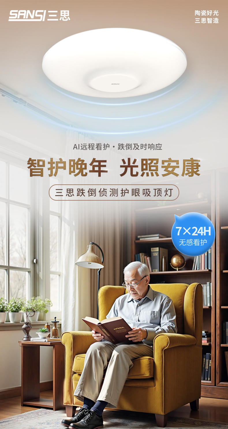 1.採用三思自主設計的反射式發光結構,光線通過反射腔反射到所設計的角度,達到理想投射面積,見光不見源,出光均勻 2.三思 LED 吸頂燈藍光危害等級達到豁免級 RG0 水平,無可視頻閃,防眩光、呵護全家人的視力健康 3.搭載毫米波雷達,AI識別跌倒,可遠程告警 4.採用光腔封閉結構設計,擁有良好的密封性,避免“黑點”,有效減少灰塵與蚊蟲進入燈體,體驗無憂 4.採用陶瓷技術,科學排列 LED 燈珠並以陶瓷作為散熱體,實現科學散熱,降低燈珠使用光衰率,延長使用壽命 5、 三檔調光 (白光、暖光、暖白光)
