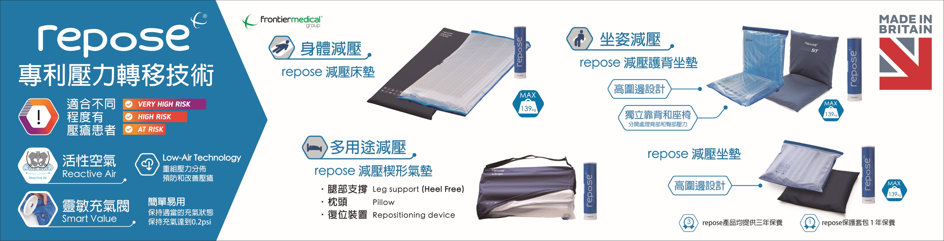 Repose is a range of reactive air, pressure redistribution and reduction support surfaces, all with high levels of immersion and envelopment. A combination of unique materials and Smart Valve Technology, has been clinically proven to deliver statistically significant patient benefits.The Repose reactive air, single cell design, offers high levels of immersion and envelopment, ensuring optimum pressure redistribution for the prevention and treatment of pressure ulcers.Repose is easy to clean in line with local policy and reusable for multi-patient use.If cared for correctly, Repose will provide pressure ulcer prevention for several years. Repose is breathable and has no sharp edges, increasing comfort, compliance and reducing the risk of tissue damage.