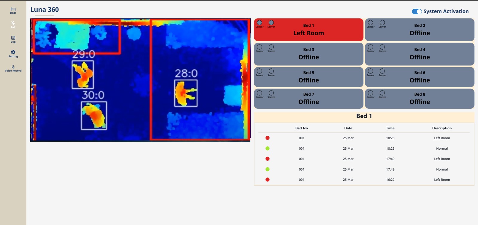 The smart monitoring system installed on the ceiling ensures that the equipment is completely out of the reach of residents. Its core technology uses advanced laser scanning solutions, which excel in protecting privacy: it only captures the depth information of the human body contour, never collects facial features or any personal biological data, and builds a solid barrier for the privacy of the elderly. The system has strong environmental adaptability and can operate accurately regardless of strong light interference or completely dark environments (including all-black scenes). The core functions include real-time motion tracking, regional headcount statistics, and intelligent warnings for dangerous behaviors (such as leaving the bed, climbing, falling, abnormal suspension, staying overtime, etc.), and the accuracy of human recognition is as high as 99.5%. A single device can effectively cover a large space of 80 square meters (about 860 square feet) and chase up to 20 people in real time. Use lidar technology to provide all-weather security protection for nursing homes.