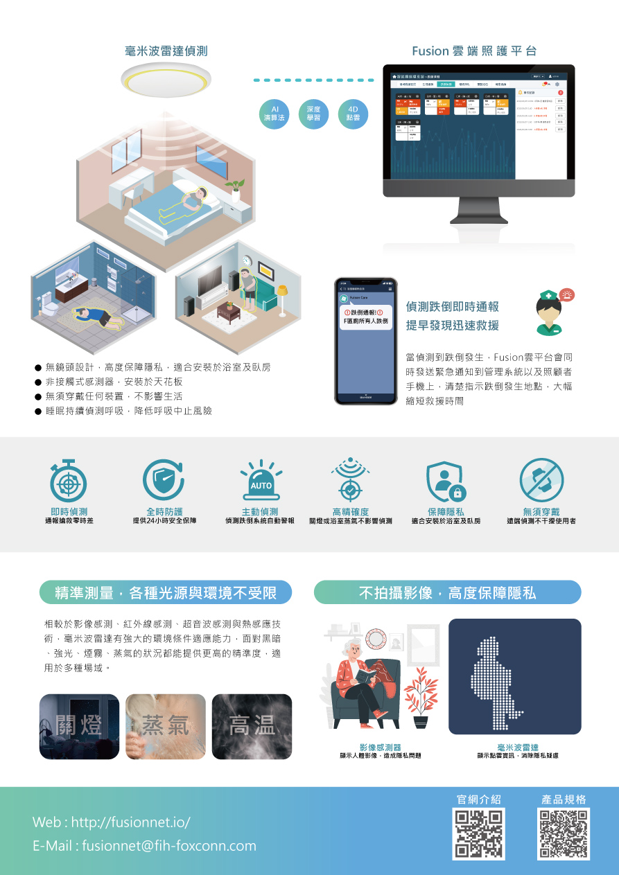 Detect fall with contactless mmWave radar sensor combined with AI engine. Immediately alert caregiver for timely assistance.