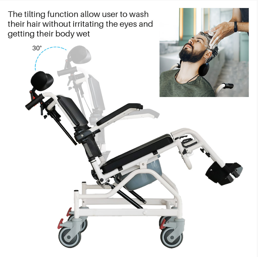 Tilting Commode is an excellent solution for users with weak core strength. The tilting function not only provides seating comfort to the user but also ensures safety during both toileting and showering needs. The adjustable head support is great for hair-wash purposes, especially for users with weakened neck muscles.