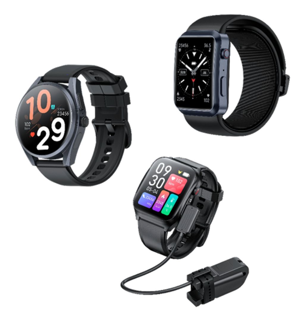 Smartwatch Functions include: Health Data Analysis (e.g. Heart Health, Blood Oxygen Level, ECG), Active Health Trend Monitoring, Step Tracking, GPS Positioning, Fall Detection, TCM Report and One-press SOS