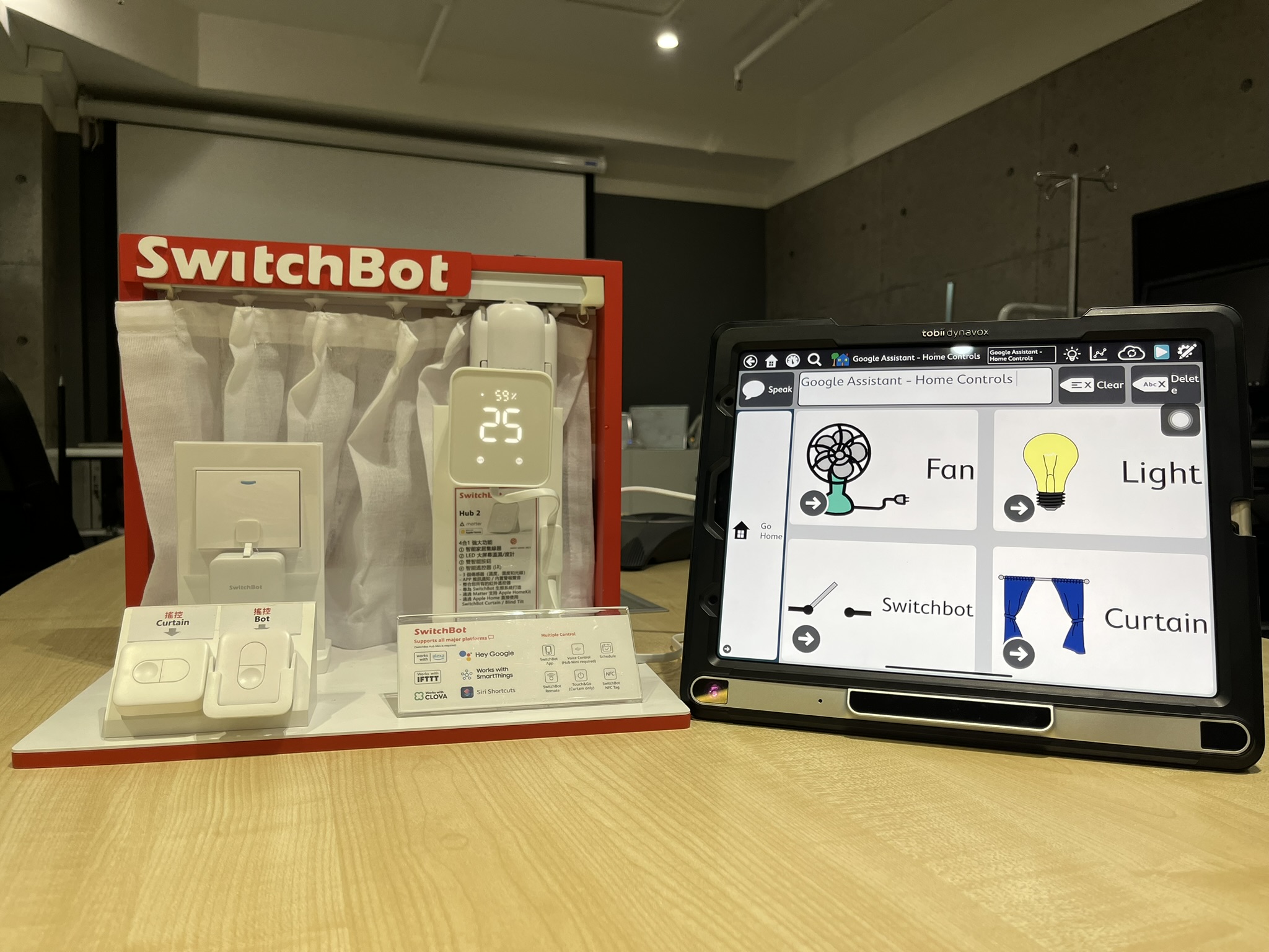 The TD Pilot eye-tracker enables users to express their needs through verbal commands, touchscreen interactions, or eye-gaze control via an iPad. It seamlessly integrates with the SwitchBot SmartHome system to manage household appliances such as lights, fans, air conditioning, and curtains, etc.