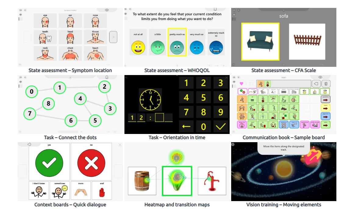 • Alternative Communication: Offers virtual keyboards, contextual boards, and a communication book with over 50,000 symbols to help users express needs and communicate