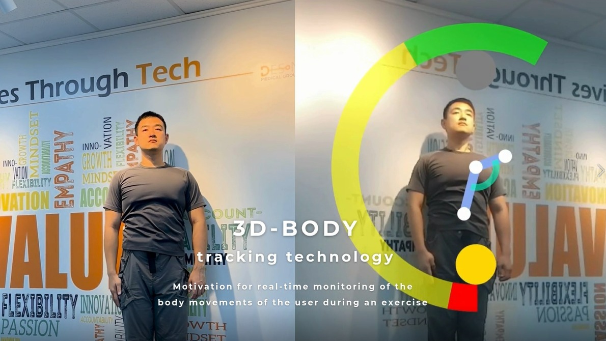 「擴增實境復康訓練」是由專業的治療師設計的復康系統,用於復康訓練期間能實時監察患者,以臨床復康訓 練活動作為基礎, 設計出有趣好玩的3D復康訓練動作, 帶給患者更好的復健體驗。復康系統中擁有超過58個度身訂造的訓練活動 ,涵蓋上肢、下肢、平衡和協調練習,患者可 跟隨治療師設定的運動教學影片及虛擬動作提示,配合體感回饋偵測,可以即時提示和糾正患者的正確姿勢。